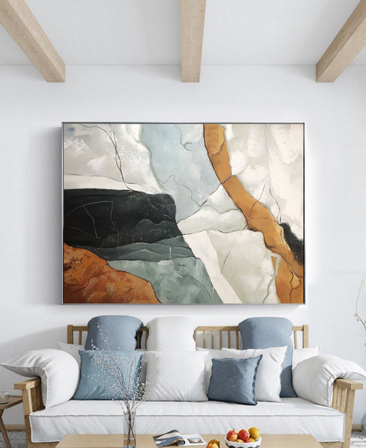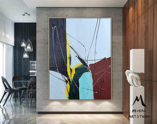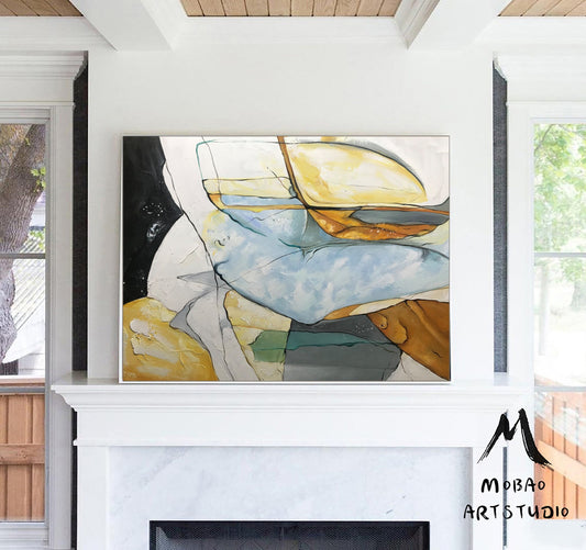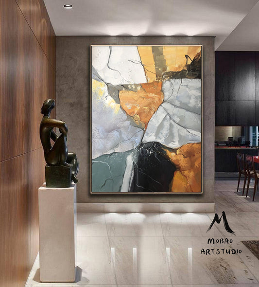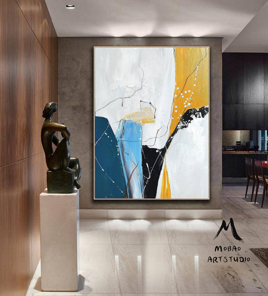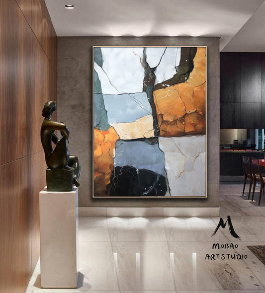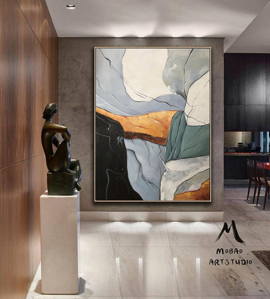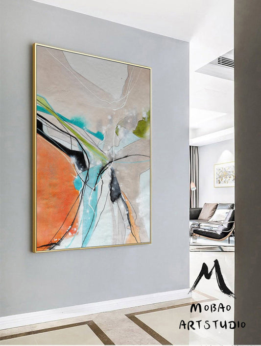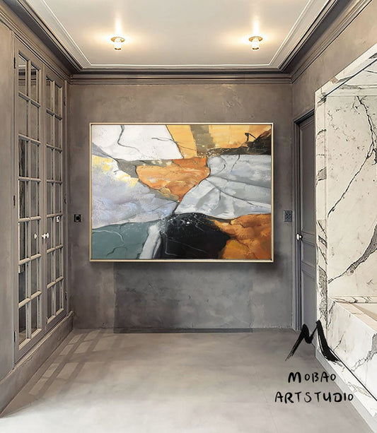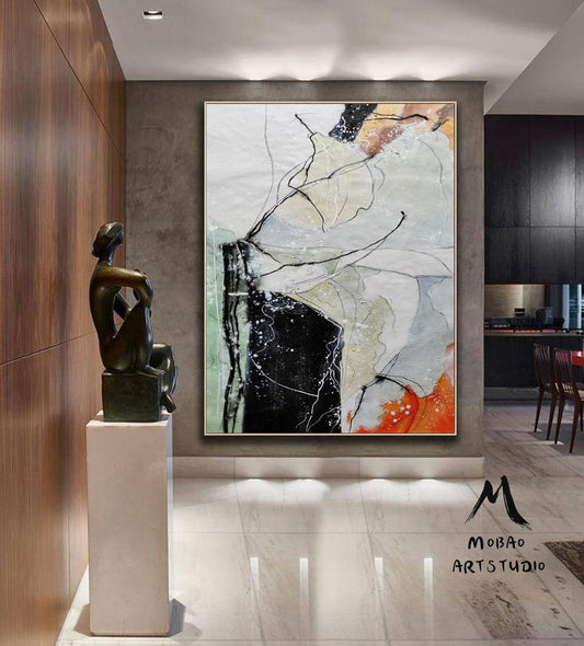 Original large-scale abstract painting, light blue painting, orange painting, black and white minimalist abstract painting, large-scale wall oil painting.