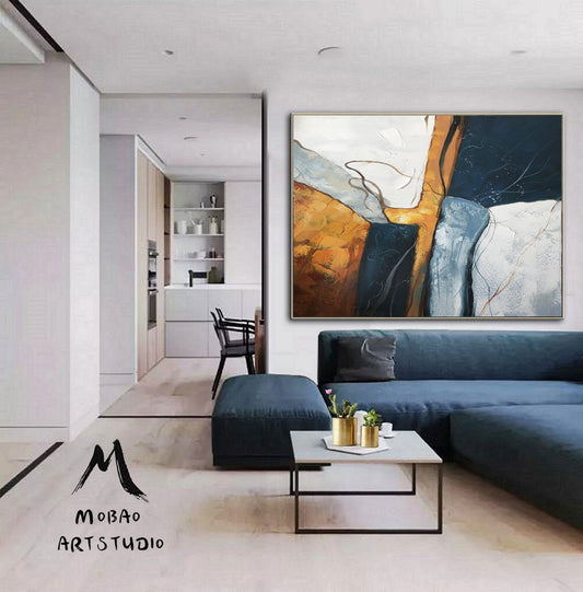 Large Gold Abstract Painting,Original Blue Abstract Painting,Minimalist Abstract Painting,Beige Painting Large Sofa Wall Canvas Oil Painting