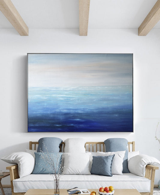 Large Blue Sea Abstract Art, Light Blue Ocean Abstract Painting,Sea Wave Abstract Canvas Oil Painting,Beige Sky Abstract Landscape Painting