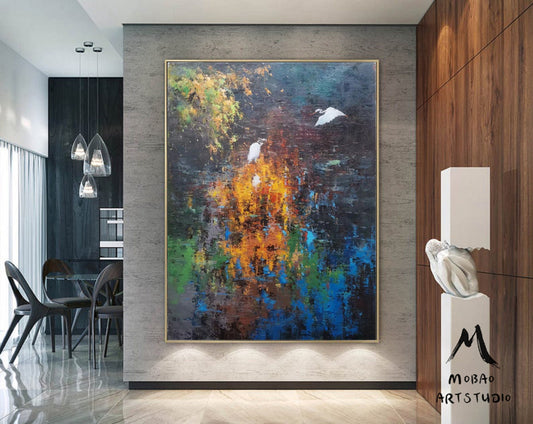 Large Blue abstract painting,Large Orange landscape painting on Canvas,Birds oil painting,Original Brown landscape painting,Living room art