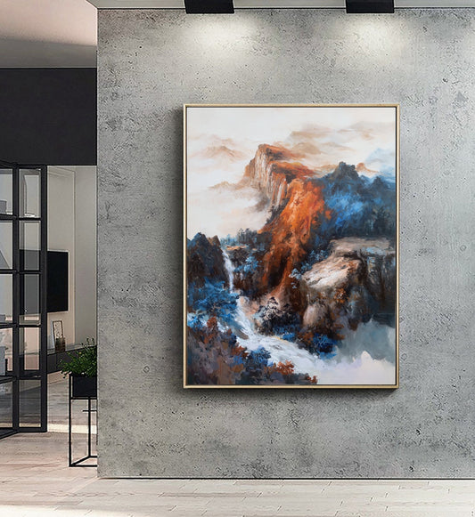 Large Blue Landscape Abstract Painting,Waterfall Landscape Painting,Original Mountain Landscape Painting on Canvas, Living Room Art Painting