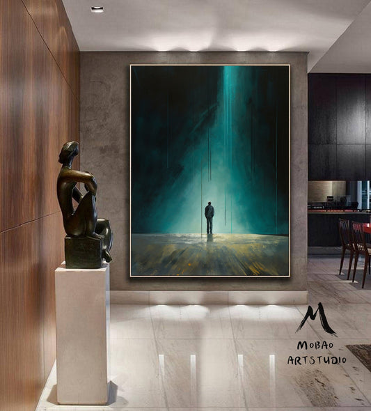 Large Black and whit abstract oil painting, Minimalist abstract painting, Scenes of people fishing on the cliffs were painted on canvas