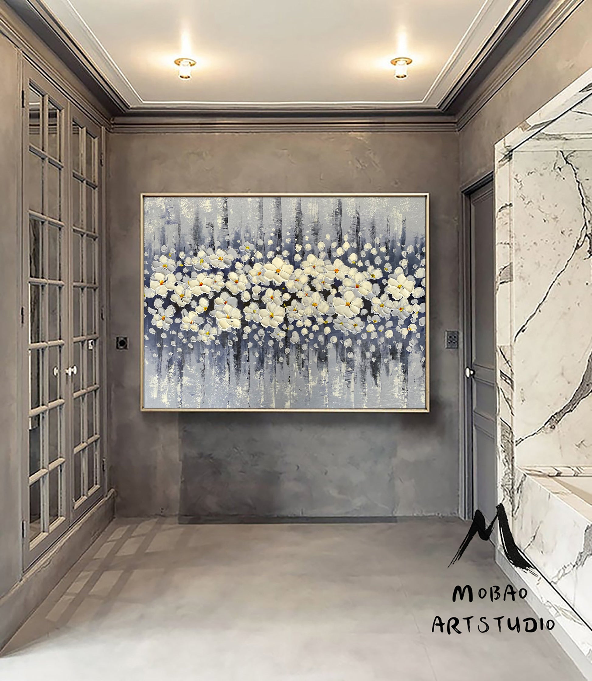 Original White Cherry Flower, Large Wall Art, Palette Knife Painting, Beige Textured Art Painting,Flower Painting On Canvas, Handmade Art