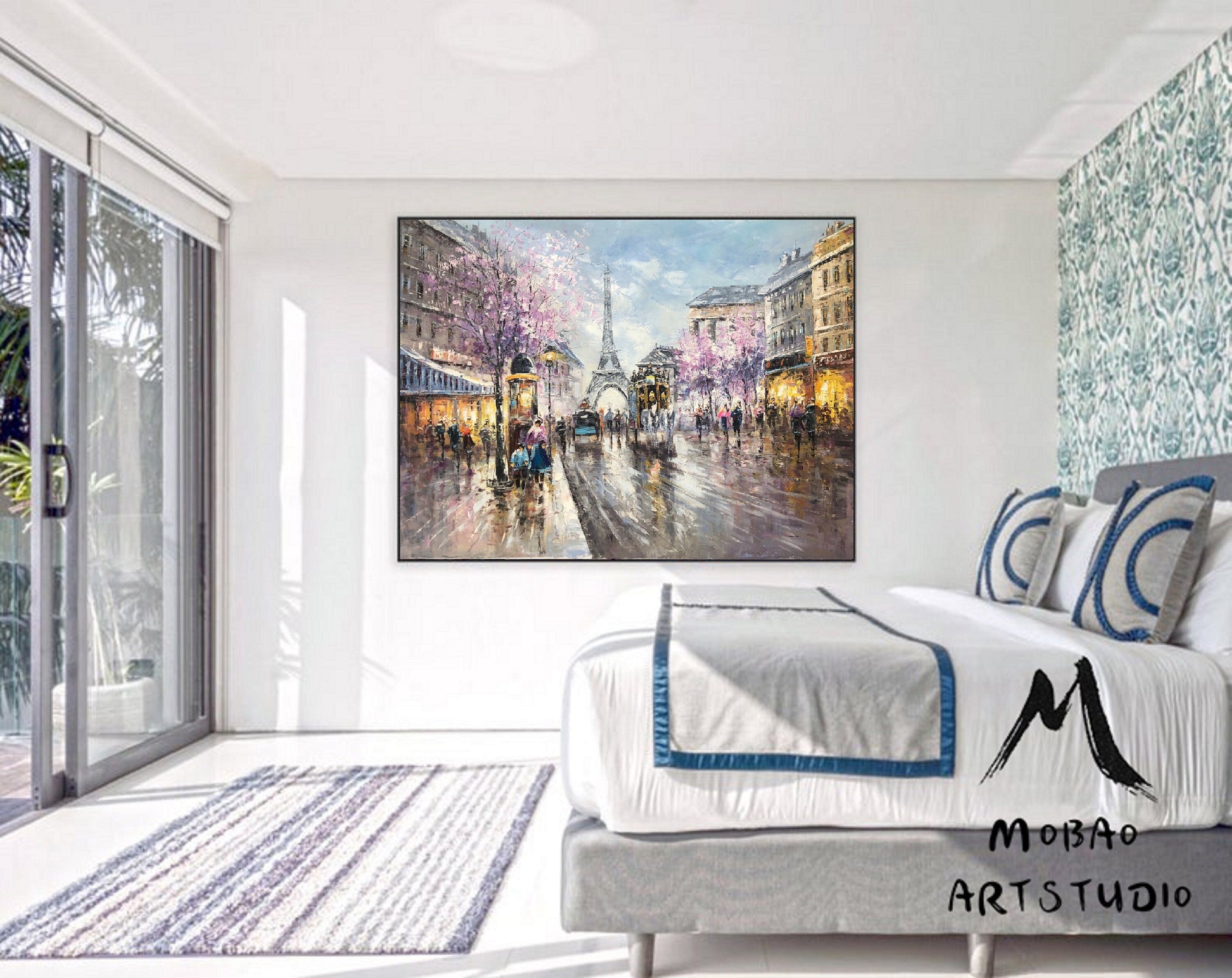 Paris City Landscape Oil Painting, Original Paris City Art Painting,People Walking In The Bustling Streets Of Paris,Living room art painting