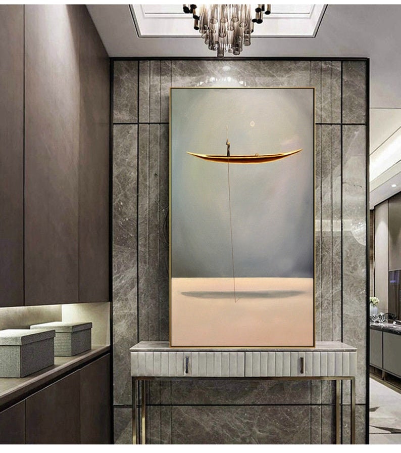 An abstract painting of a floating canoe,Abstract oil painting artwork Sailboat painting Wooden tall ship,Sky art oil painting Boat painting