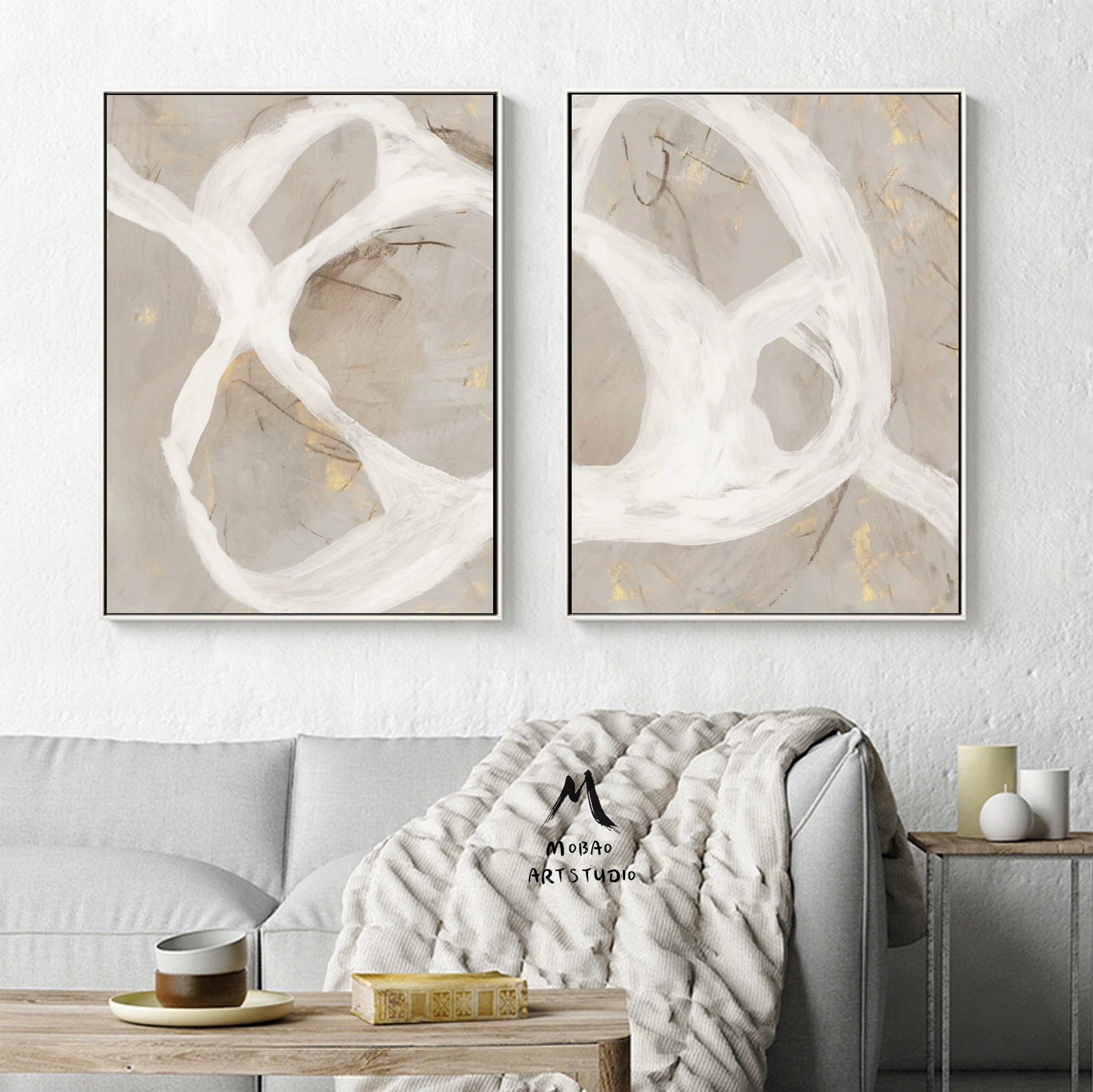 Set of 2 White Abstract Art Beige Abstract Art Boho Wall Art Beige Canvas Art Set of 2 White Beige Wall Art Painting Beige Minimalist Art
